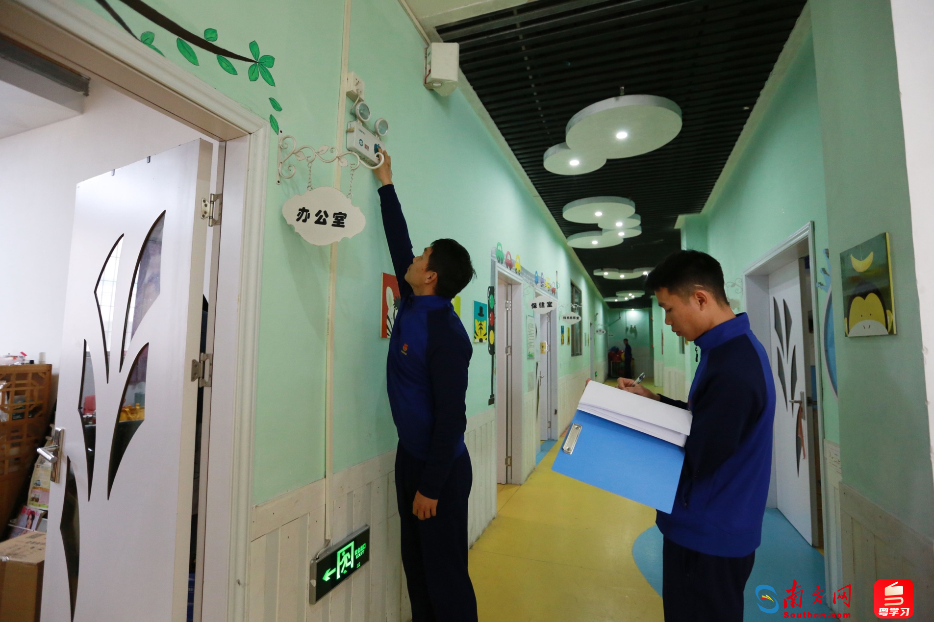 “你们这个窗户是逃生窗,是不能封住的。如果需要救援,我们是通过这个窗口来救人的。”消防救援支队清远大道特勤站的陈炜成和队友正在幼儿园开展“六熟悉工作”。从幼儿园外部的消火栓到楼内放置的灭火器、应急照明灯,陈炜成都和队友一一查看是否能够正常使用,在楼梯间、过道查看安全出口有无堵塞的情况……
