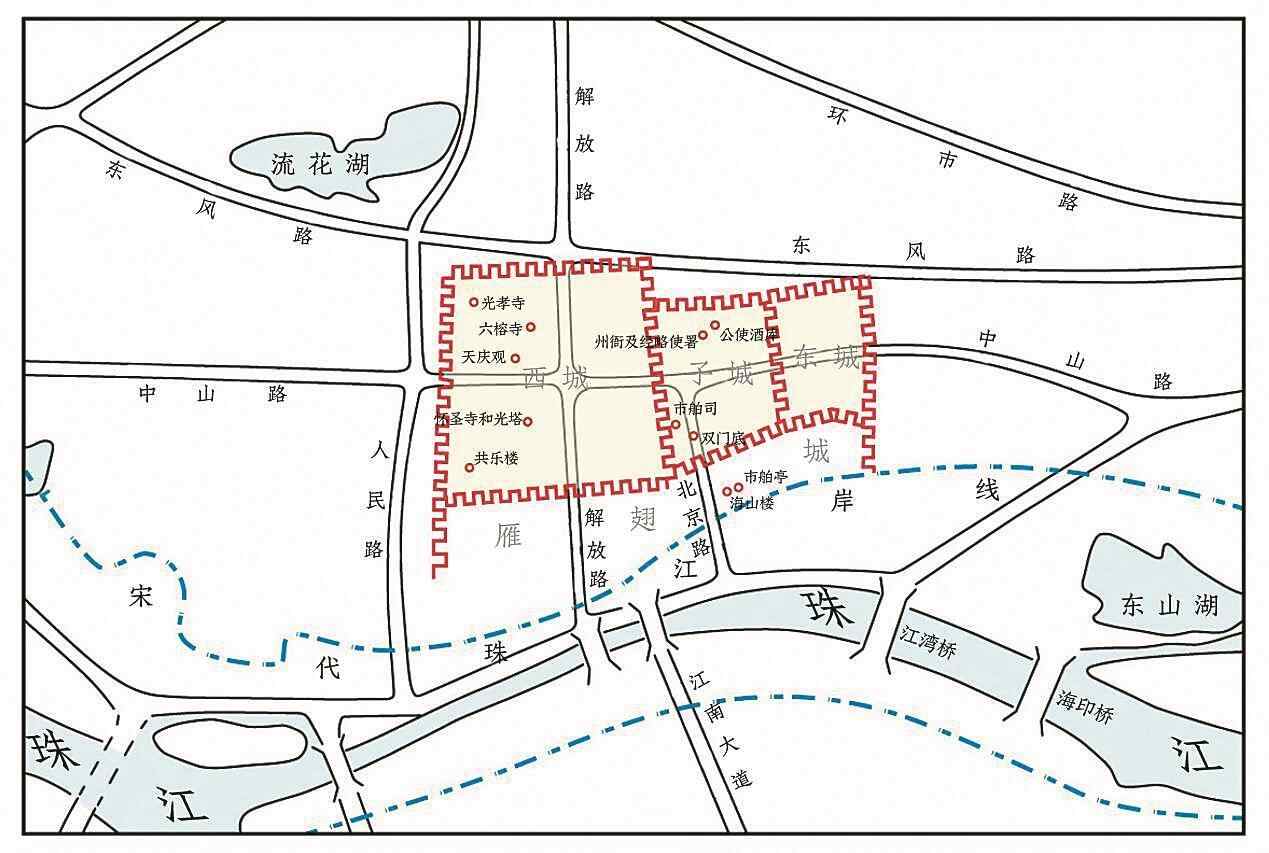 宋代广州三城的地理位置何在?据文献记载,宋代广州子城是在晚唐五代广州城的基础上重修而成。2000年在西湖路惠新西街和龙藏街之间发掘的唐代城墙基址,呈南北走向,应为唐末刘岩扩建新南城时修筑的广州城的西城墙,亦即宋代广州子城的西城墙。2024年“小马站-流水井”古城遗址公布的最新考古发掘成果也显示,该区域东部应亦为从汉代至唐广州城的西城墙、宋代广州子城的西城墙。《海录碎事》云:“药洲,在广州朝天门外。南汉氏于兹种药。”可见药洲位于宋代子城西门外,是南汉时开凿而成的。药洲在今教育路南方剧院北侧仍有遗迹保留。从文献记载可知,现吉祥路和教育路一带在南汉时分别为玉液池和药洲,是一片较为宽阔的园林水面,到宋代时,这一带仍然是公共园林水面。宋代广州子城的西城墙就在这一片水域的东侧,即今天吉祥路东侧的华宁里一线。
