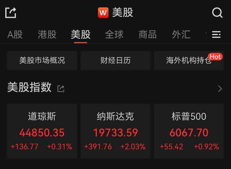 截至收盘,道指涨0.31%报44850.35点,标普500指数涨0.92%报6067.7点,纳指涨2.03%报19733.59点。