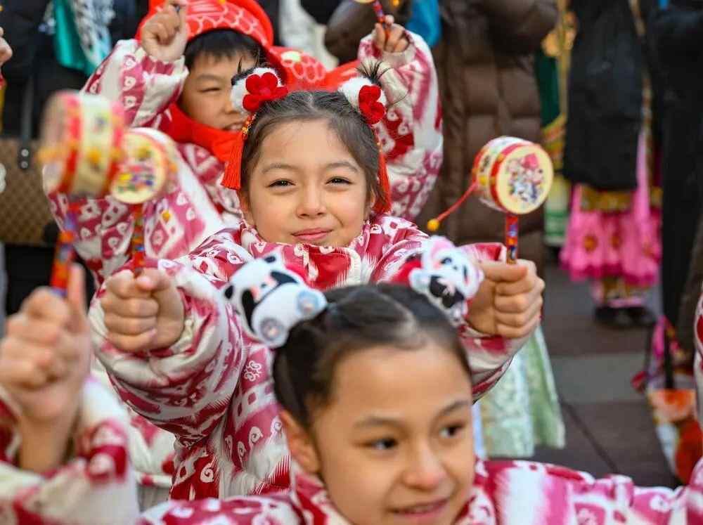 △新疆大巴扎社火迎新春,孩子们在现场表演。