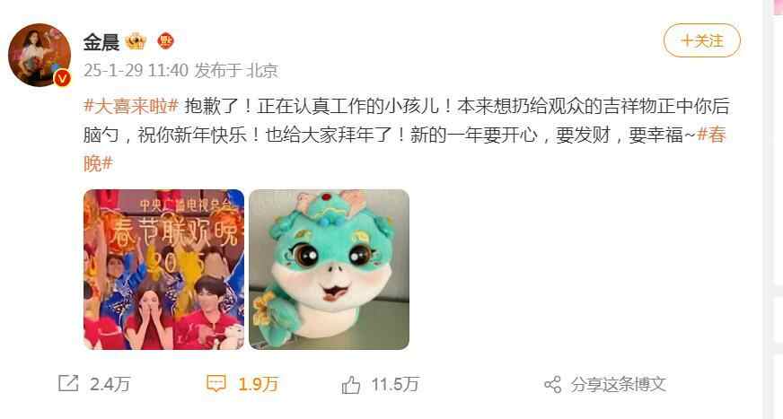 29日,金晨主动回应了“捅这么大的篓子”,她解释说,当时本来想把吉祥物扔给观众的,没想到正好砸中了一位小孩儿的后脑勺,她也借此事,向这位孩子表达歉意,并祝他新年快乐。全文如下: