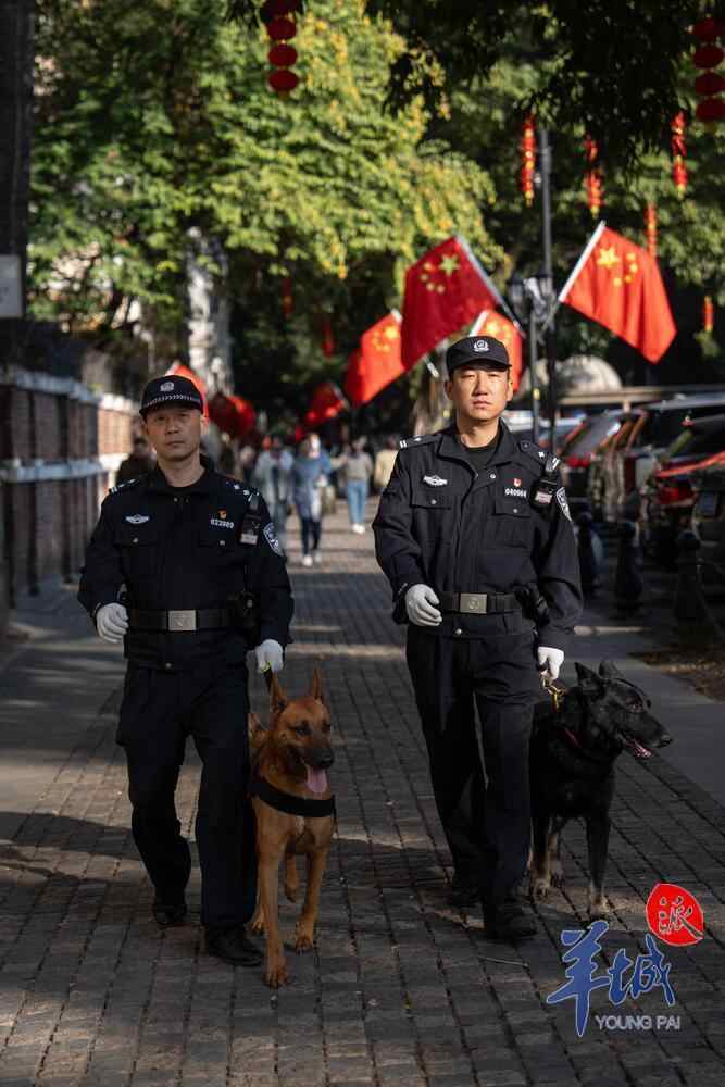 当天下午两点,数只威武霸气的警犬出现在沙面岛,瞬间成为游客相机的主角。这支来自广州公安的“汪汪队”分成两组,由训导员带领开展作业。广州市公安局刑警支队六大队副大队长高兴介绍,参与本次烟花汇演安保的犬只为搜爆犬和防暴犬,承担安全检查、巡逻防控、区域警戒等任务,主要通过定点值守、交叉巡逻等方式全面覆盖工作区域。
