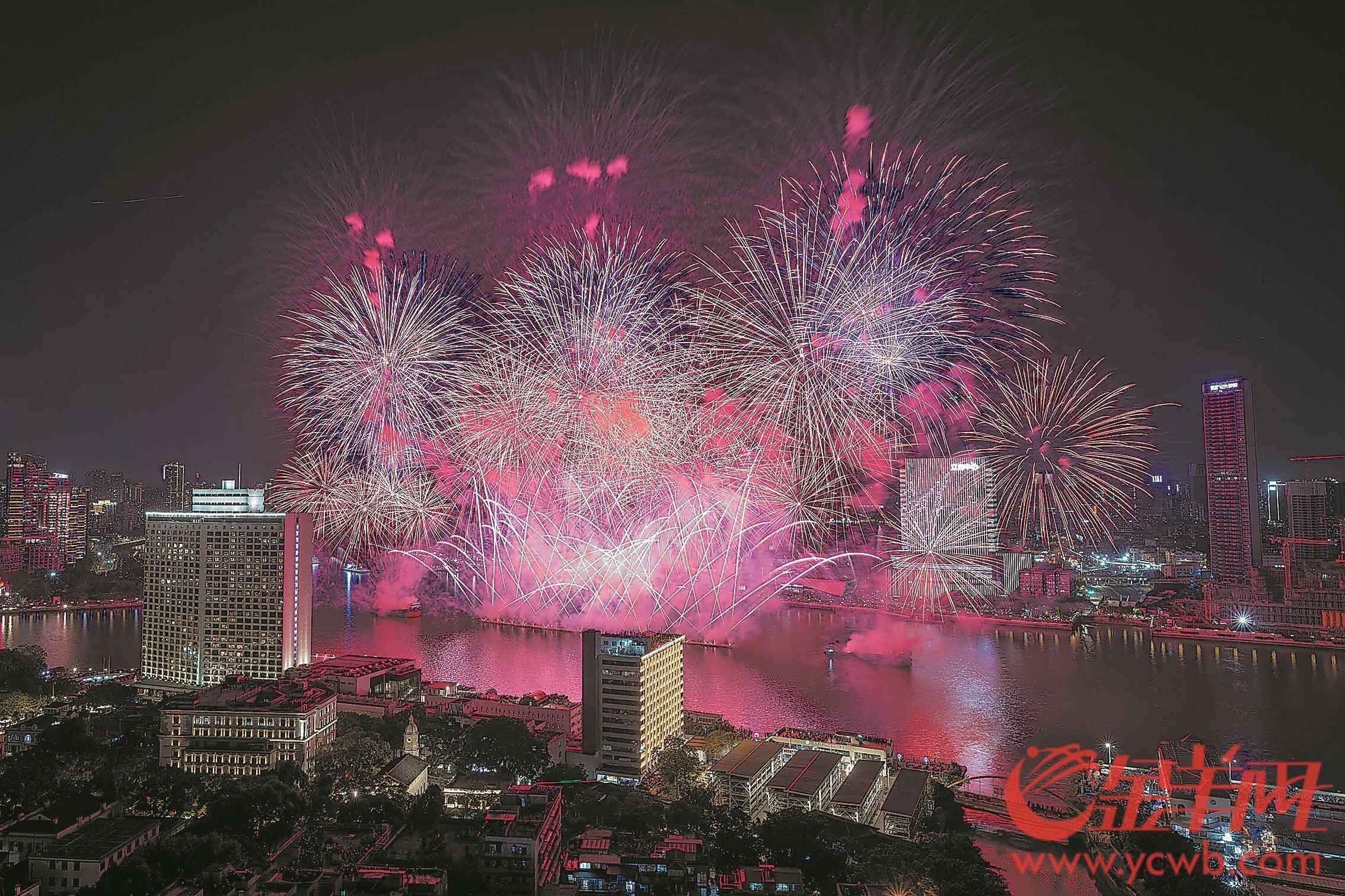 据悉,今年烟花品类更新、数量更多,打造了高、中、低空多视角烟花,视觉跨度拓展至650米,烟花汇演吸引了白鹅潭周边约40万市民游客围观欣赏。