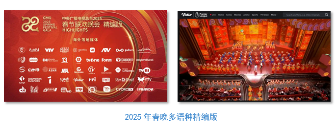 总台迅速译配英语、法语、西班牙语、阿拉伯语、俄语、葡萄牙语、意大利语、捷克语、塔吉克语、日语、泰语等18个语种字幕解说,连续第四年打造春晚精编版节目,比去年新增7个语种,持续拓展春晚在地化深度传播。自大年初一起,春晚精编版陆续在俄罗斯VK视频平台、白俄罗斯文化广播电台官网、巴西劳动者电视台、塔吉克斯坦希纳摩电视台、印尼Vidio视频网站、泰国电视五台、柬埔寨柬华时报网站、也门电视台、阿尔及利亚国家电视台、突尼斯国家电视台、南非德班电视台、马里国家电视台等65个国家和地区的156家媒体落播,较去年分别增长20%和12%。此外,春晚精编版还将在海外多国电影院线放映。
