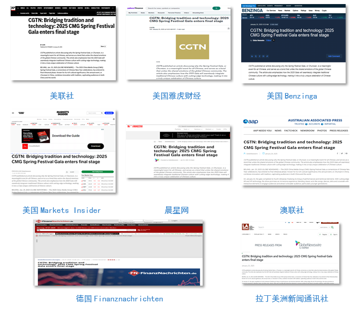 总台通过82种语言传播平台快速编译播发多语种特稿,重点展现《栋梁》《喜上枝头》《潮起舞英歌》等舞蹈、武术、戏曲节目亮点,充分彰显中式美学的生动气韵和中华优秀传统文化的深厚底蕴。相关报道被法国《创业》媒体集团、德新社新闻资讯频道、华尔街在线网、意大利谷歌新闻网、葡萄牙《太阳报》、阿尔巴尼亚国家电视台、《赫尔辛基时报》、保加利亚“24小时”网、克罗地亚今日奥西耶克网、蒙古国国家电视台、柬埔寨国家电视台、斯里兰卡国家电视台、老挝国家电视台、泰国国家电视台、阿联酋通讯社、伊拉克国家通讯社等海外主流媒体广泛转载转发。