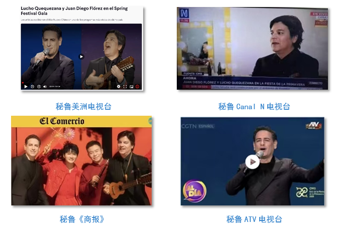 秘鲁媒体高度关注中国民歌《兰花花》遇上秘鲁名曲《山鹰之歌》,中国民族乐器唢呐与秘鲁民族乐器排箫在春晚舞台音律和鸣,尽显文化交融的美妙。除夕当天,秘鲁国家电视台、美洲电视台、Canal N电视台、拉丁电视台、ATV电视台、安第斯通讯社、秘鲁《商报》等10多家秘鲁主流媒体全程直播和报道总台蛇年春晚。