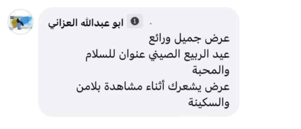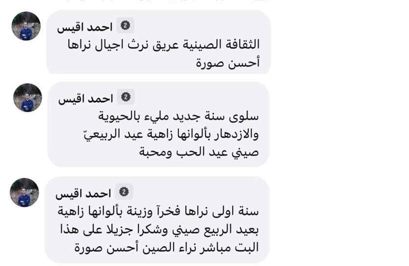 也门网友阿布·阿卜杜拉·阿扎尼留言:“精彩的表演!中国春节是和平与爱的象征,春晚节目让人在观看时感受到平和与安宁!”