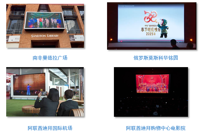 海外耀千屏。全球87个国家136座城市共计3508块公共大屏直播和宣介总台春晚。南非约翰内斯堡坦博国际机场、南非曼德拉广场、俄罗斯莫斯科华铭园、阿联酋迪拜国际机场候机楼大厅、阿联酋迪拜购物中心电影院等地大屏实时直播总台春晚,沉浸式感受中国春节、中华文化的独特魅力。