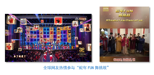 总台在海外社交媒体发起“蛇年FUN舞挑战”新媒体互动活动,全球阅览量4.06亿,视频观看量2.32亿,全球网友与中国歌手联屏共舞《一起China Fun》。曾收到习近平主席复信的南非德班理工大学孔子学院学生、英国格拉斯哥市副市长安·麦塔格特、德国知名文化博主罗伯特·阿道夫、俄罗斯花样滑冰名将安娜·谢尔巴科娃 、捷克小提琴家及歌手姿娜、韩国传统音乐家权泰庆、柬埔寨知名歌手哥萨玛姗以及来自美国、加拿大、澳大利亚、法国、阿根廷、墨西哥、土耳其、印度、日本、沙特等70多个国家和地区的网友积极参与互动活动。