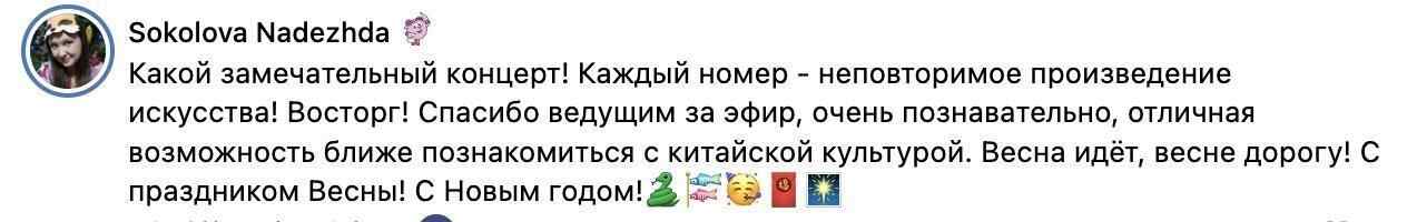 俄罗斯网友哈桑·哈姆里留言:“多么精彩的文艺晚会!每一个节目都是一件独特的艺术品!感谢俄语主持人(伴随式)直播,非常有帮助,这是更深入了解中国文化的好机会。春天来了,春节快乐!新年快乐!”