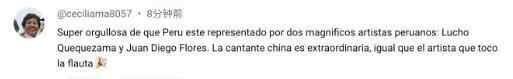西班牙语网友塞西莉亚留言:“超级骄傲总台春晚有两位杰出的秘鲁艺术家代表:柯克萨纳和弗洛雷兹。节目上的中国歌手(周深)也非常出色,演奏的艺术家也同样棒!”