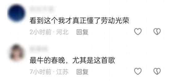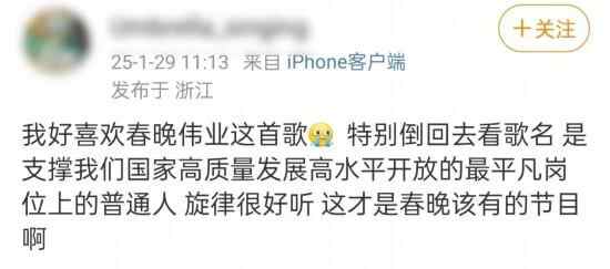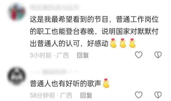 正如赵麟所说,大家每唱一次《伟业》,对这首歌的情感都会有一层新的理解和感受。早在第一次听到农民歌手刘广局唱出“爱的火焰永不熄灭”时,导演组就觉得一下燃起来了。万家灯火的除夕春晚舞台上,他们的表演也让不少网友点赞“看了特感动!这才是国家的基石”“大家都在各行各业发光”……