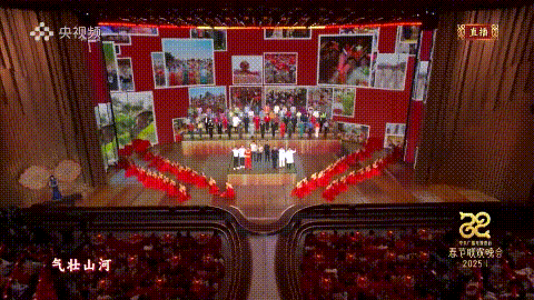 大屏内容处处紧扣每句歌词传达的意涵,并与镜头调度和歌手表演有所呼应,共同将春晚舞台上的《伟业》带到舞台之外的万里江山。今年春晚贯穿观众席的“如意”造型也加强了视觉上的延伸感,用屏幕为歌手、现场观众和大小屏前的观众营造了一场“直下看山河”的沉浸式体验。此刻,江山与人民的意象自然而然地融为一体。