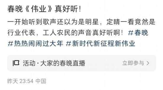 词曲、歌声、表演和舞台呈现拧成一股绳,最终成就了春晚歌曲《伟业》的惊喜亮相,用一首歌的时间,为人民写下一封长信。大家的笑脸,正是这封长信的生动落款。歌曲播出后,第一时间收到了评论区网友的热情回信。