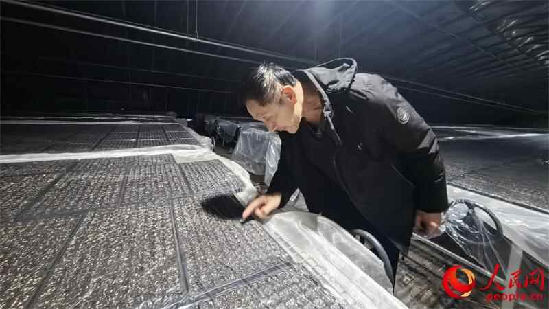 青格达湖乡天山村村民刘建军在清洁能源智能温室育苗大棚里仔细观察茄子苗的情况。人民网记者 陈新辉摄
