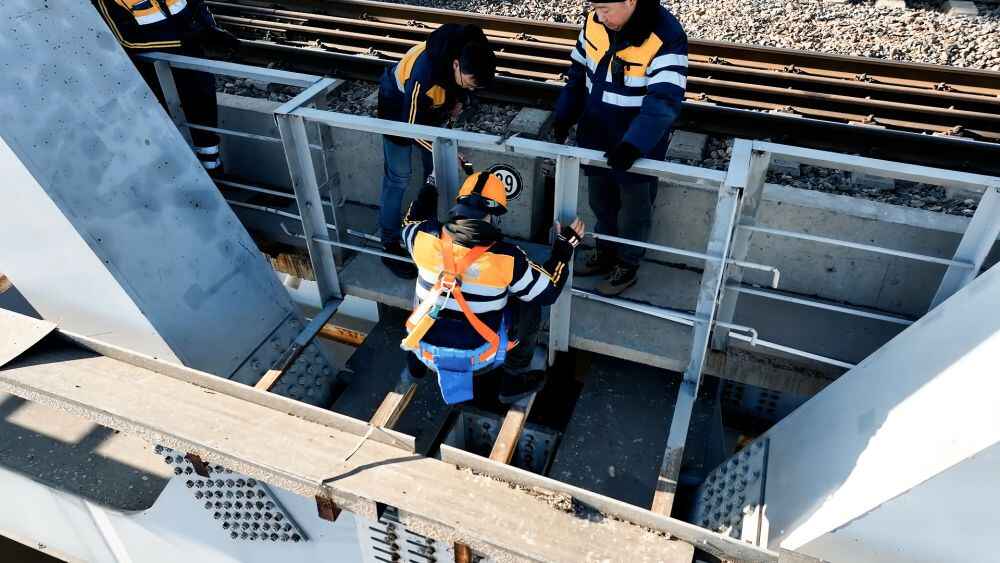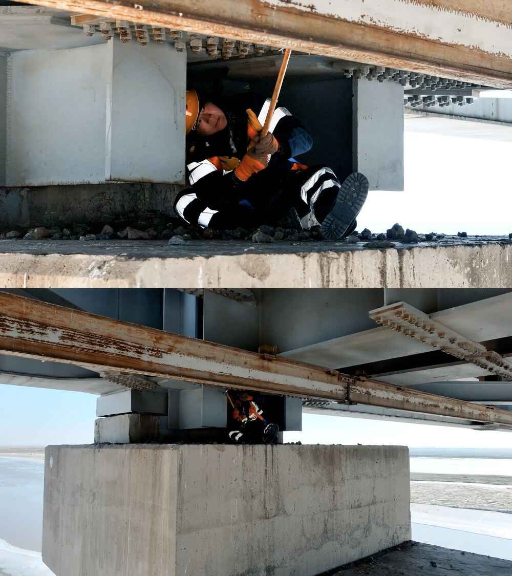 检查桥墩上的螺栓时,人是无法站立的。新华社发