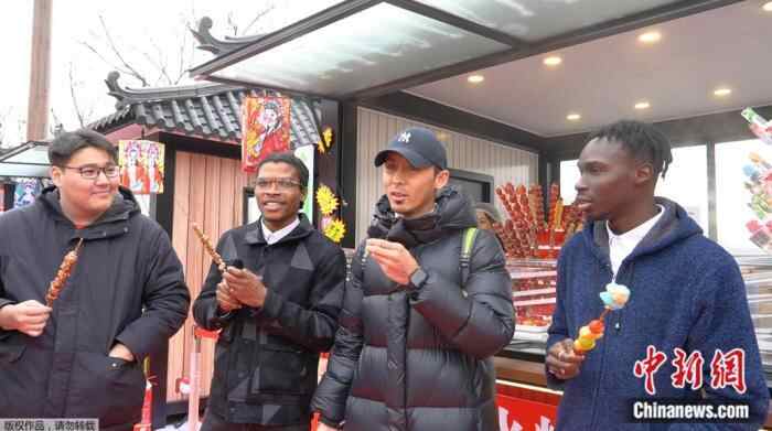 来自北京工业大学的四位留学生在北京通州大运河新春游园会上品尝冰糖葫芦。中新网 林勐男 摄
