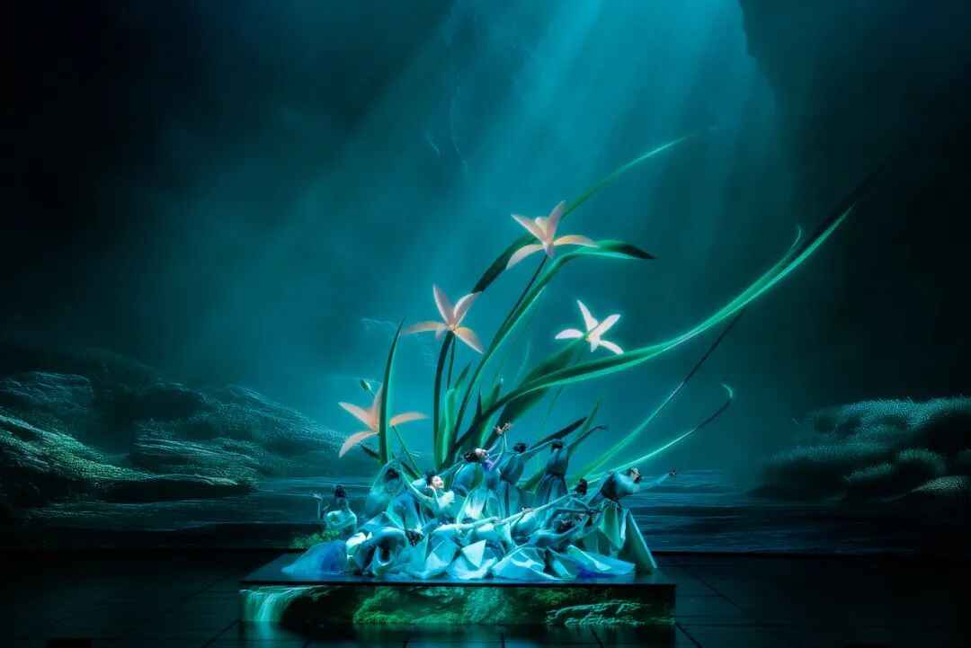 一束光线穿透山谷的沉静,一下子让舞台有了静谧而悠远的氛围感,在层叠晕染的光影中,兰花的剪影悄然浮现,超越尘世喧嚣的“君子之姿”跃然而出。影随人动,光因舞活,舞者指尖轻点,复又绽放,仿佛兰花破土而出,迎风而立。