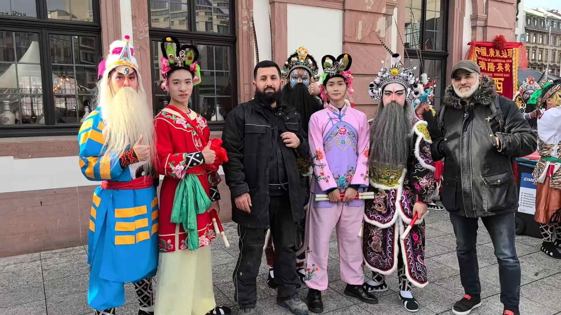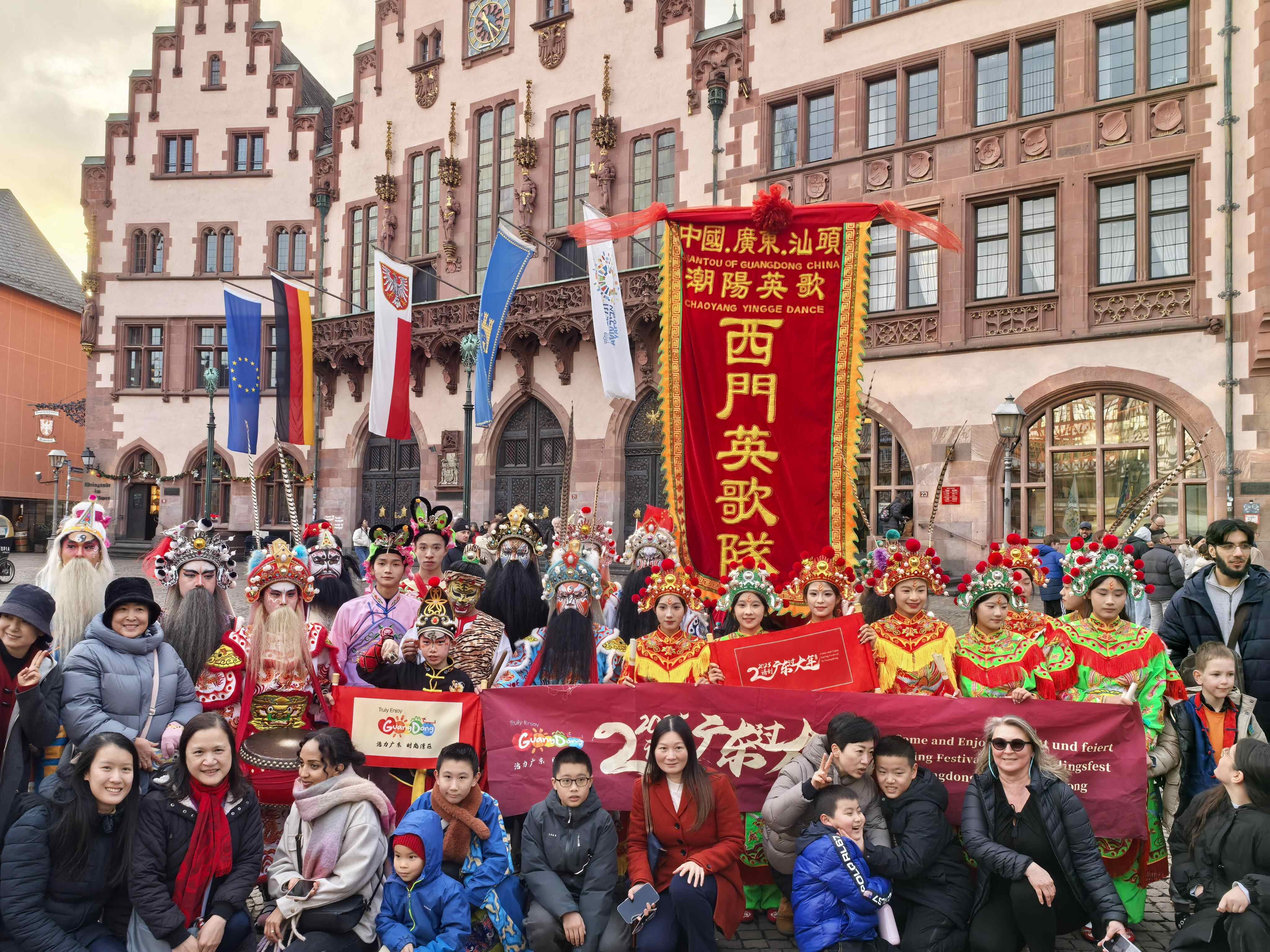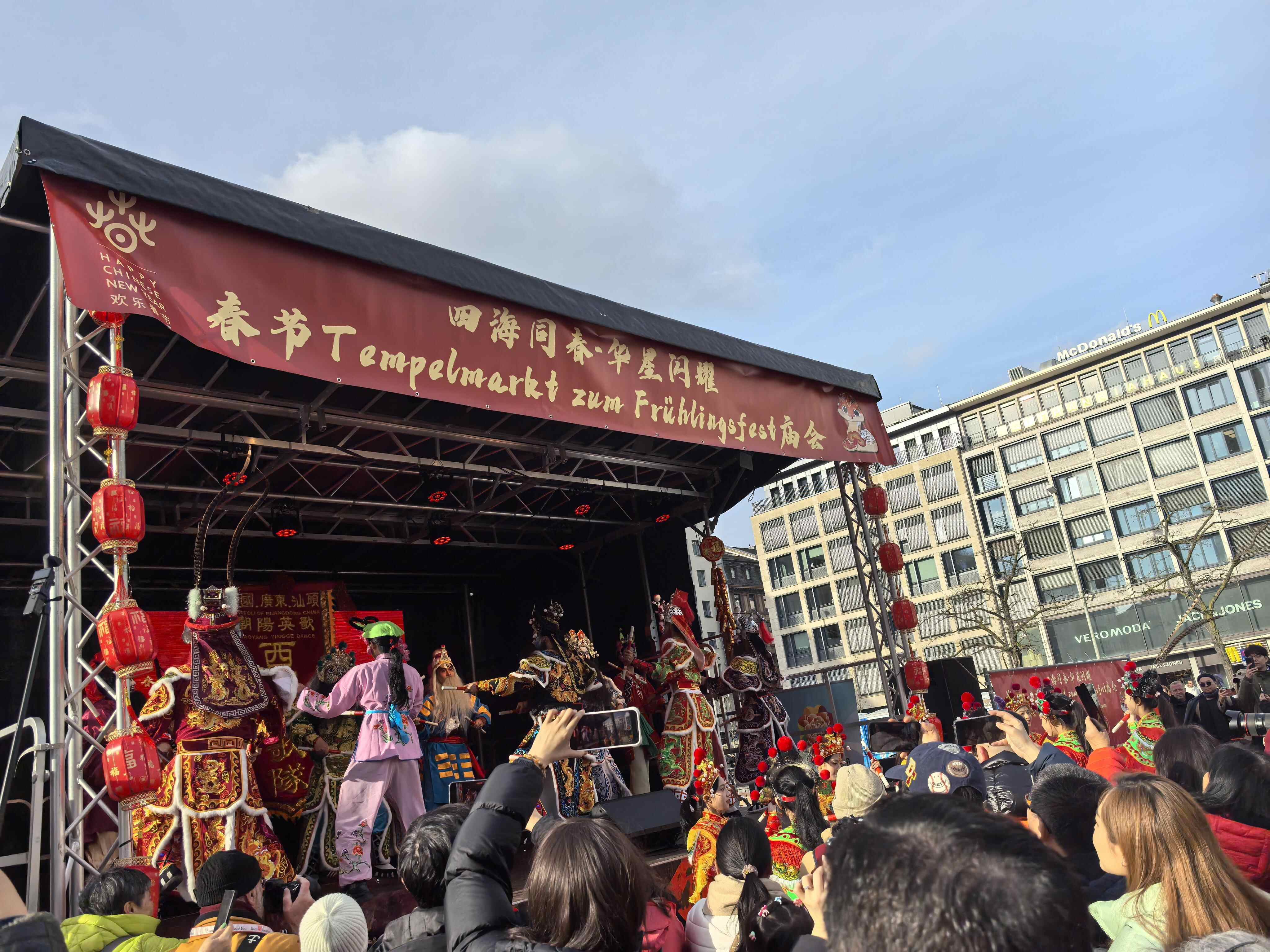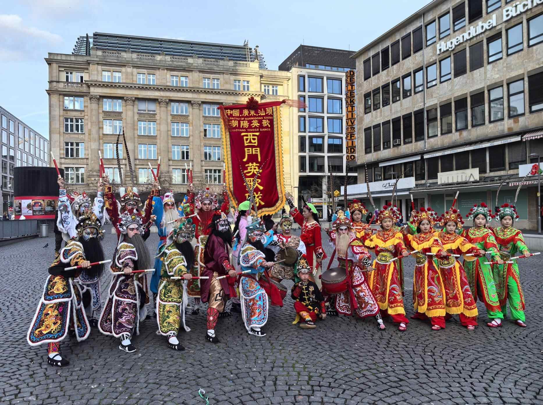 法兰克福市中心卫戍广场(Hauptwache)人头攒动,来自广东汕头潮阳的西门英歌队带来英武大气的英歌开场表演,拉开此次春节庙会的序幕。