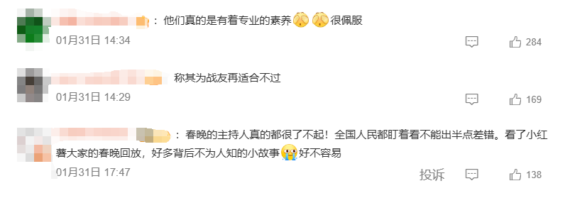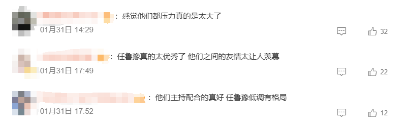在春晚后台直播中,尼格买提透露,任鲁豫在结束春晚最后一分钟主持时眼睛泛红,“压力挺大的,他扛下了所有,零点倒计时留给鲁豫哥的时间比任何时候一次彩排都长。”任鲁豫回应:“我眼圈红跟这个一点关系都没有,这个倒计时完全是我们几个(主持人)配合完成的,合作好几年了,我们已经是战友的状态。”