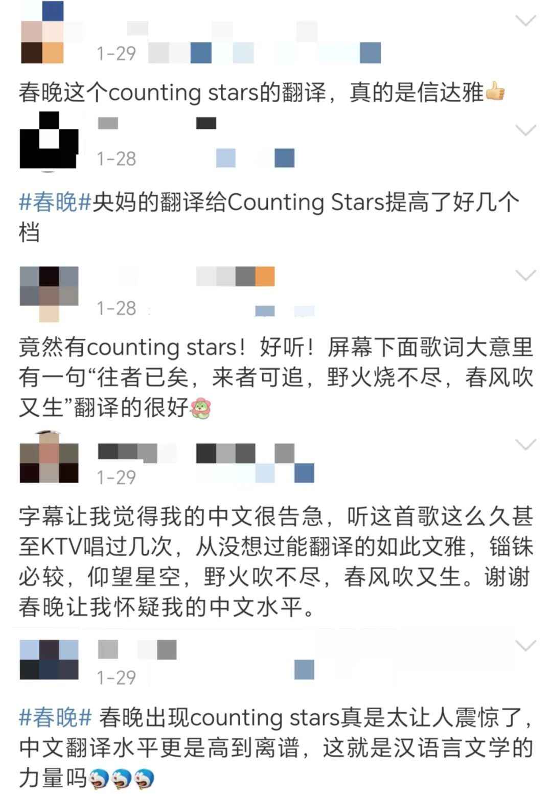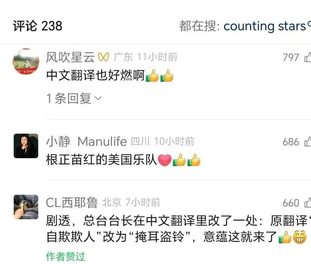 《数星星》是这支美国乐队久唱不衰的名曲,其歌词的中文翻译也极为优美。包括引用了“野火烧不尽,春风吹又生”等中文名句。不过,细心的观众发现,此次蛇年春晚演出时,歌词又有一处修改,原译的“自欺欺人”被改为“掩耳盗铃”。据知情人士剧透,这处修改同样出自总台台长慎海雄之手。