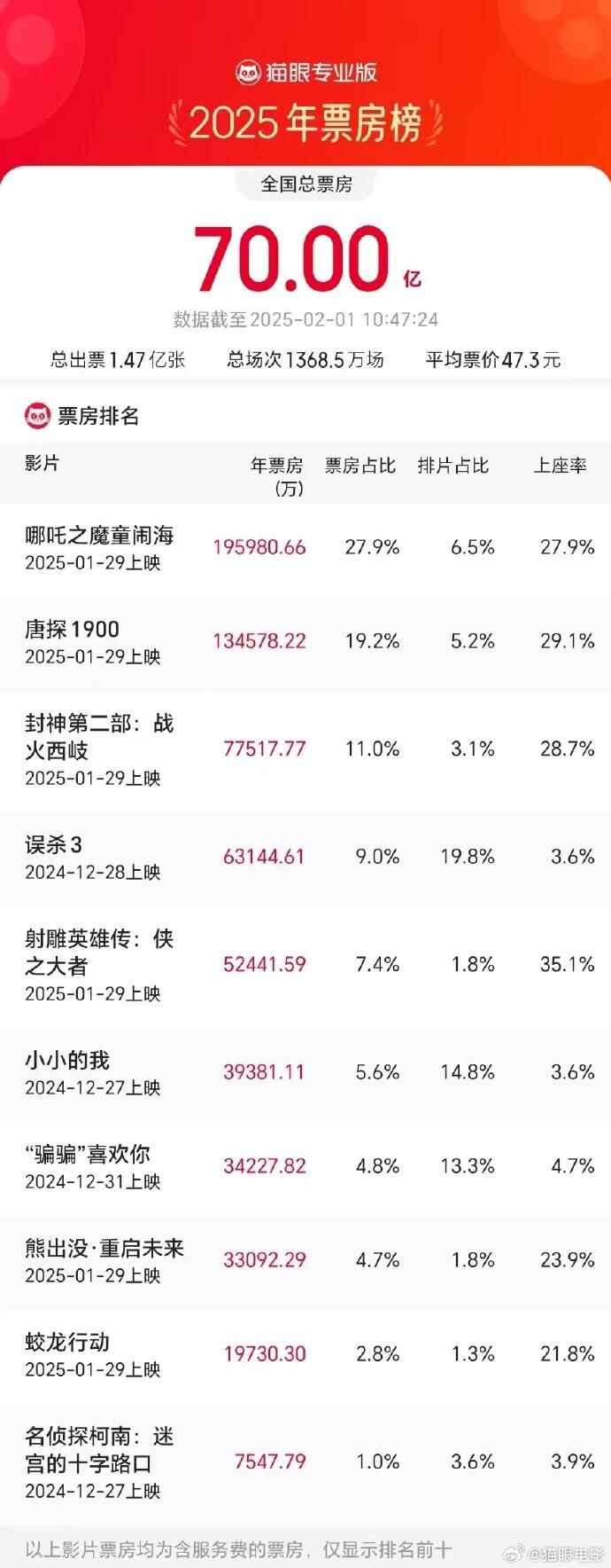 据猫眼专业版数据,2025年2月1日10时47分,2025年度票房(含预售实时)破70亿,《哪吒之魔童闹海》暂列年度票房榜首位。