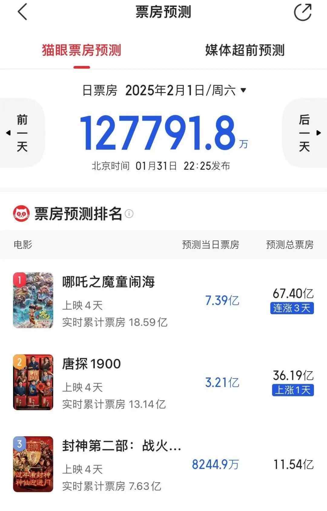 灯塔专业版《哪吒之魔童闹海》最新预测《哪吒2》总票房为61.16亿元,而猫眼专业版预测《哪吒2》总票房达67.4亿元,预测票房皆超过《长津湖》的57.75亿元。《哪吒2》也有望成为影史首部票房破60亿元的电影。