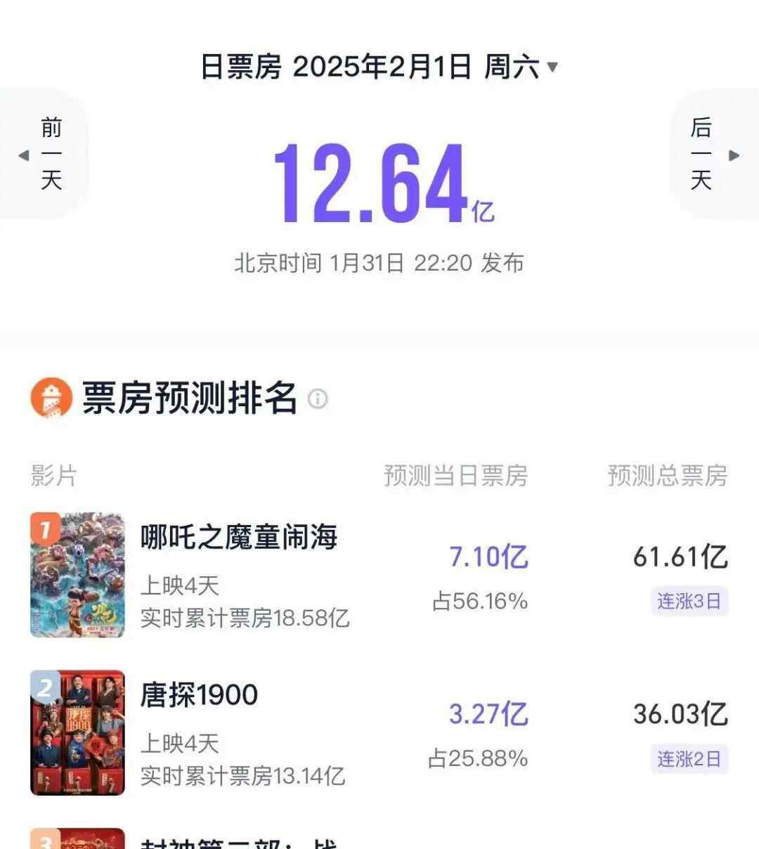 1月31日,电影《哪吒之魔童闹海》(《哪吒2》)单日总票房超6.1亿元,这也是中国电影票房排行榜上第三部单日票房破6亿的影片。