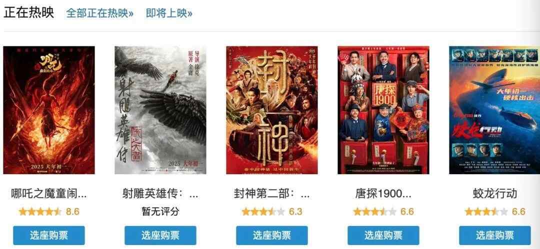 今年大年初一,共有六部国产新片集中上映,包括《封神第二部:战火西岐》《哪吒之魔童闹海》《唐探1900》《蛟龙行动》《熊出没·重启未来》《射雕英雄传:侠之大者》。