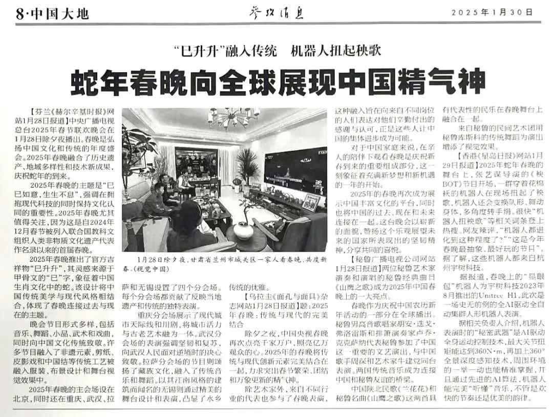 1月30日出版的《参考消息》刊发多家境外媒体报道,认为总台蛇年春晚向全球展现中国精气神