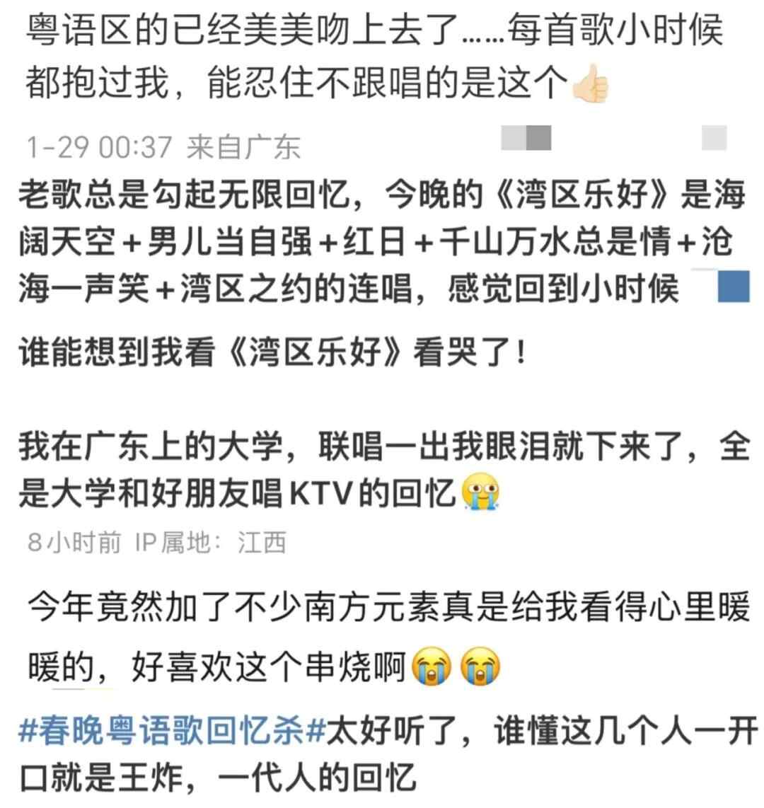 湾区金曲串烧,耳朵亮了!节目《湾区乐好》串烧《红日》《海阔天空》《男儿当自强》《万水千山总是情》《沧海一声笑》等经典粤歌,这些刻在广东人基因里的旋律,唤起了多少人的光辉岁月青春回忆。汪明荃、陈小春、张智霖等湾区面孔更让观众惊喜,“春晚下了大功夫,原汁原味唱粤语歌,开口即王炸”。