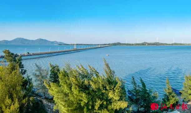 站在红海湾经济开发区风车岛对岸极目远眺,连岛路横跨湖面紧连风车岛,融汇湖光山色,陶醉蓝天碧海