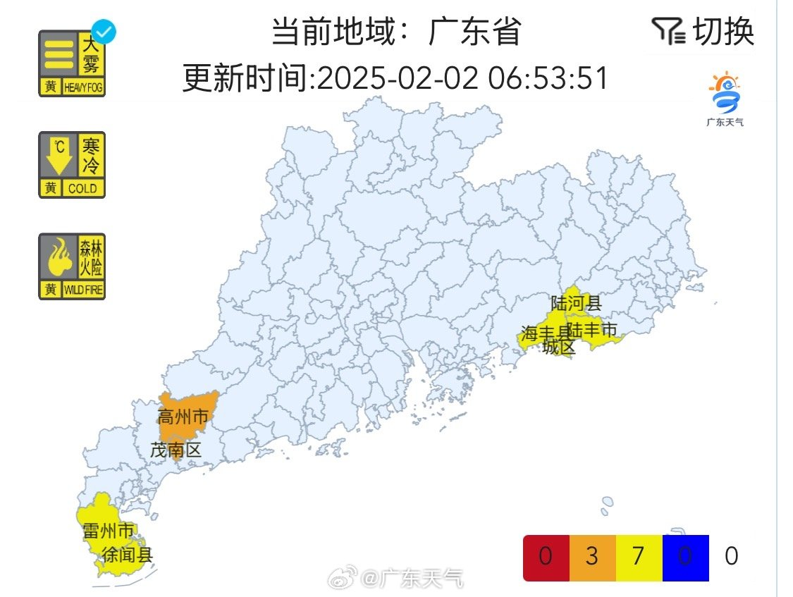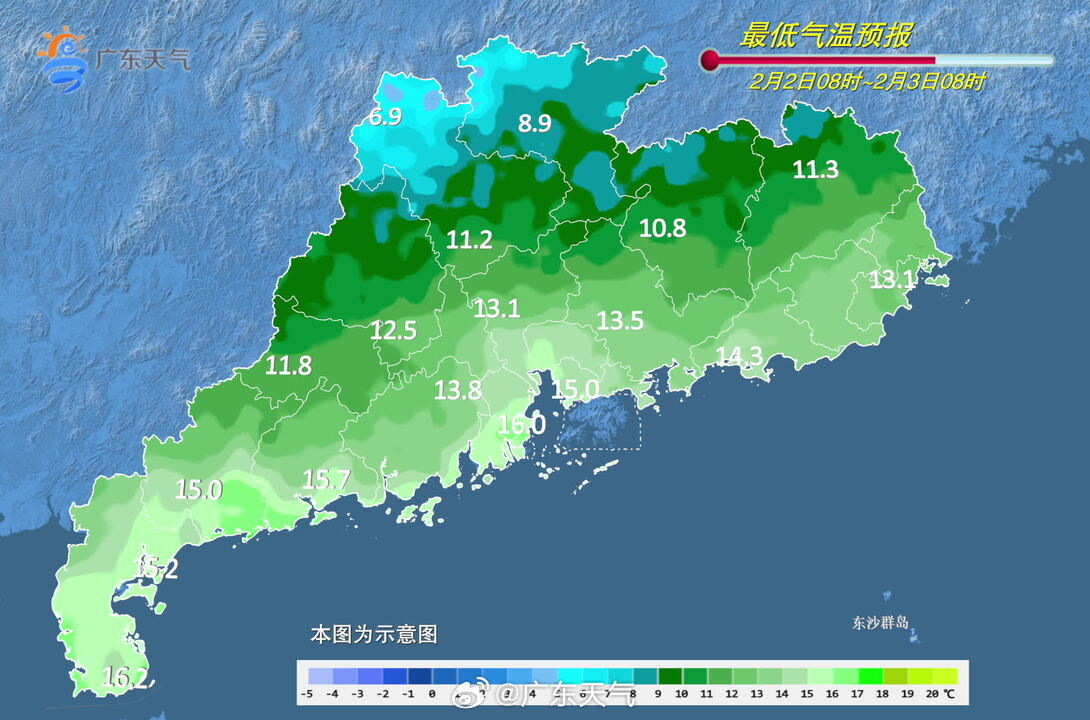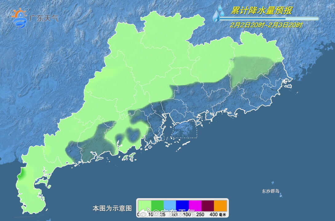 @广东天气 预计,2月2日-4日,受新一股冷空气南下影响,广东省日平均气温将累计下降5~8℃,西部市县伴有零星小雨。2月2-3日,广东省中南部市县和中西部海面早晨有(轻)雾。