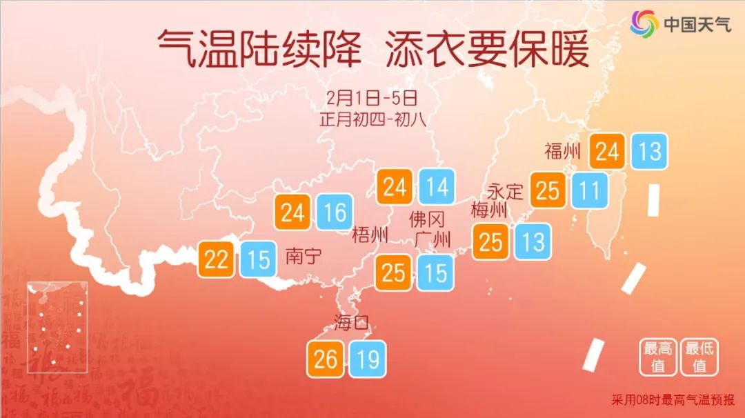 初五(2月2日),粤北、粤西和珠江三角洲西部市县阴天间多云,有小雨,其余市县多云间阴天,局部有小雨。中南部市县和中西部海面早晨有(轻)雾。受冷空气影响,粤北气温开始下降,早晨最低气温:粤北市县8~12℃,粤西沿海市县17~19℃,其余市县13~17℃。