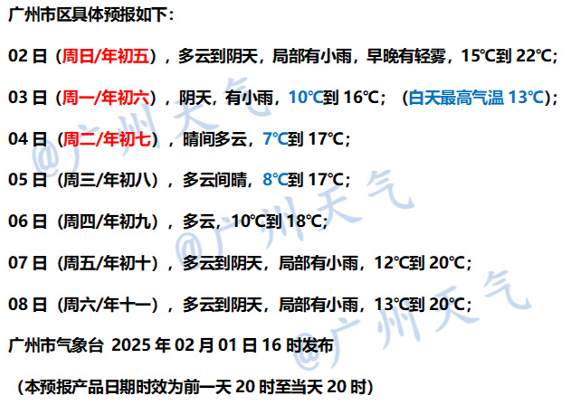 广州气象台预计,2日(初五)广州市云量仍然较多,局部有小雨,早晚有轻雾;3日(初六)起受新一股冷空气影响,阴天有小雨,气温明显下降,港区和高地阵风加大到6~8级。