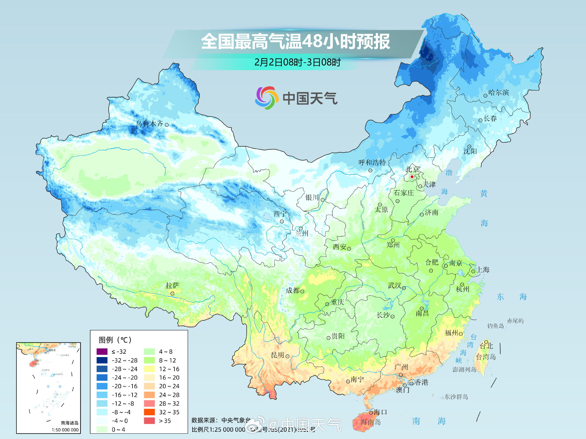 预计,大年初五(2月2日)至初六,将有一股冷空气影响我国中东部地区,大部气温下降4~6℃,西北地区东南部、华北北部、东北地区、江南东部、华南等地部分地区下降6~8℃,北方地区伴有4~5级风,阵风7~8级。东部和南部海域有6~8级、阵风9级大风。其中东北地区多地最高气温将频繁处于-10℃以下,最低气温则多不足-20℃。