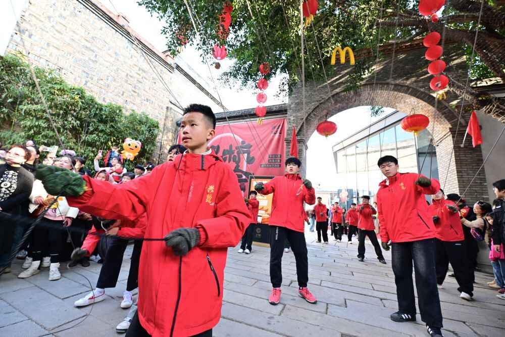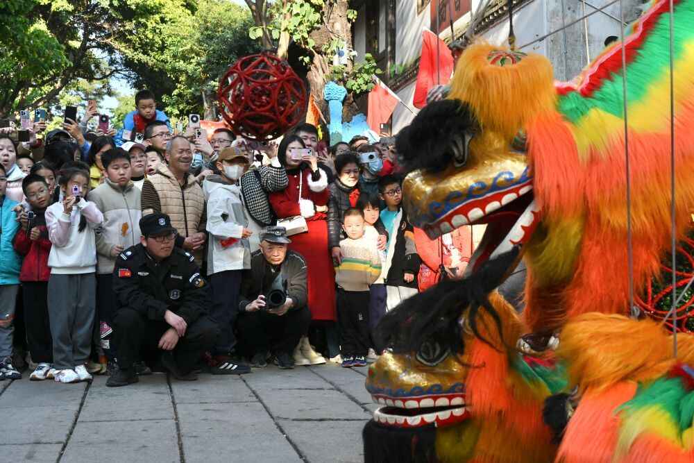 1月30日,兴贤少年线狮队在福州市上下杭历史文化街区表演,让现场观众大饱眼福。