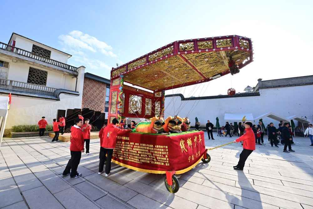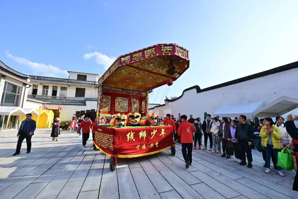 1月30日,福州市上下杭历史文化街区,受邀前来参加新春非遗表演活动的兴贤少年线狮队走进表演场地。