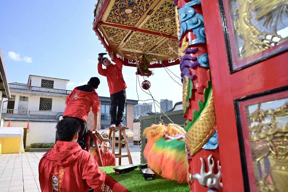 1月30日,福州市上下杭历史文化街区,受邀前来参加新春非遗表演活动的兴贤少年线狮队在演出前准备。