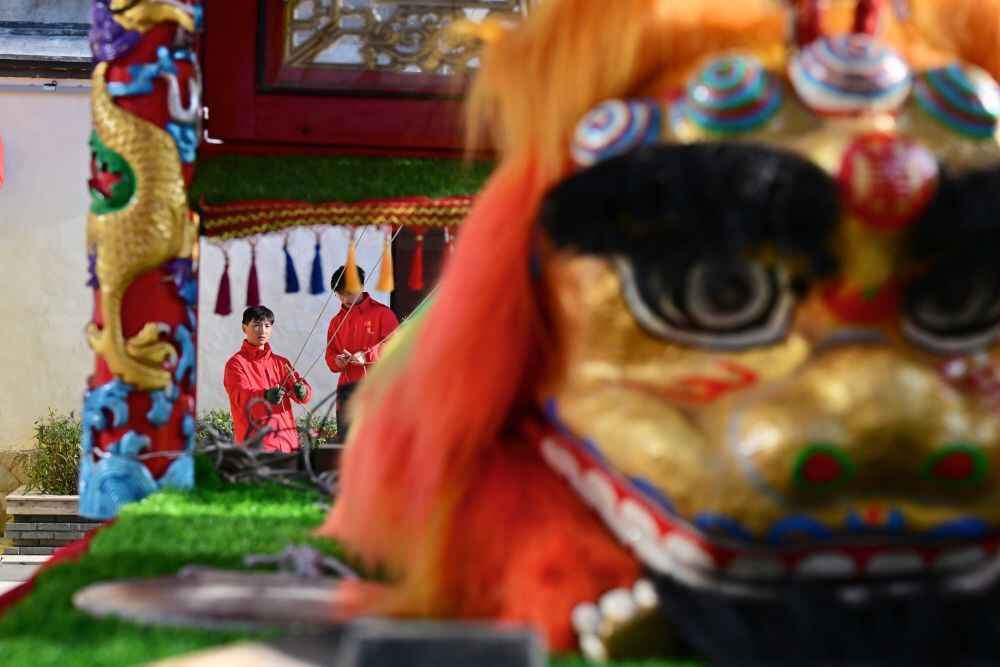 1月30日,福州市上下杭历史文化街区,受邀前来参加新春非遗表演活动的兴贤少年线狮队队长陈吉宏在演出前检查。