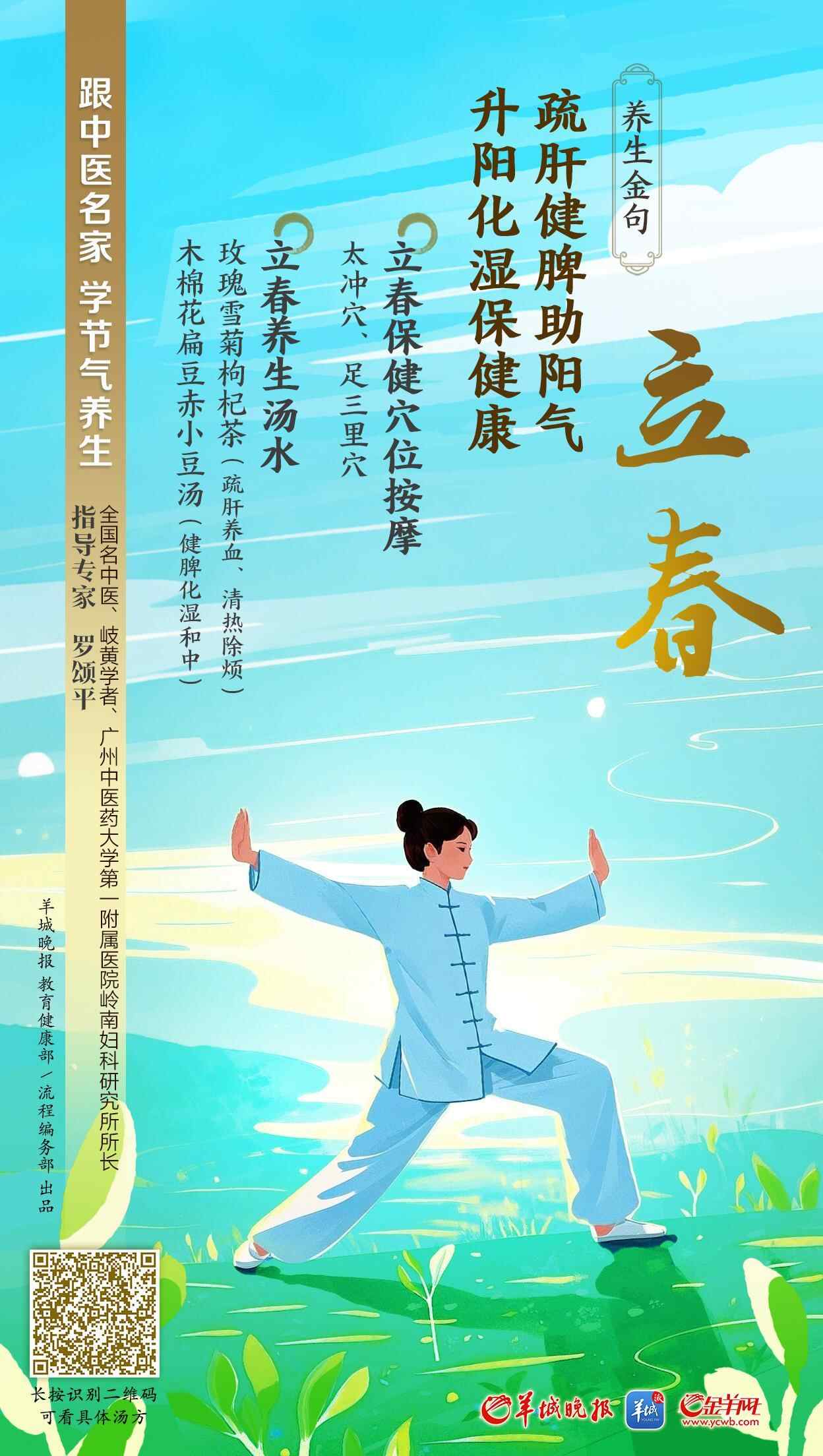 初春寒湿如何化解?春季应如何养生?春天如何运动生阳?全国名中医、岐黄学者、广州中医药大学第一附属医院岭南妇科研究所所长罗颂平提醒,春气养生,首重户外运动,阳气升而肝气畅。此时记住四句养生金句:“一年之计在于春,未雨绸缪正此时。疏肝健脾助阳气,升阳化湿保健康。”