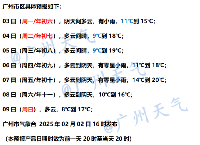 初七(2月4日),粤西市县多云,其余市县晴到多云。最低气温:粤北市县4~7℃(高海拔山区零下1~1℃),南部市县10~13℃,其余市县7~10℃。