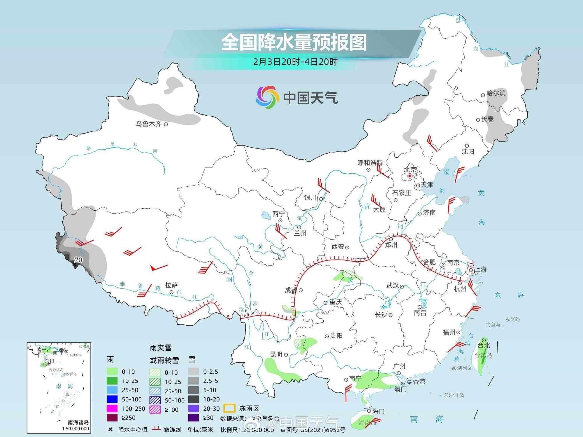 2月3日08时至4日08时,贵州大部、湖南南部、广西、福建和海南阴天有小雨,周边省份的其余地区阴天间多云,局部有小雨或(轻)雾。