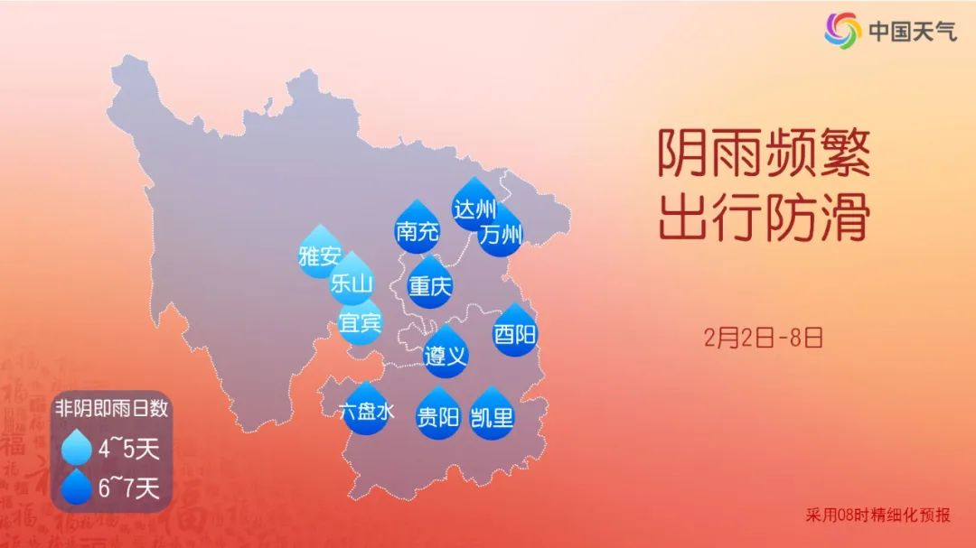 2月4日08时至5日08时,贵州北部阴天有小雨,周边省份的其余地区阴天转多云,早晚有(轻)雾。