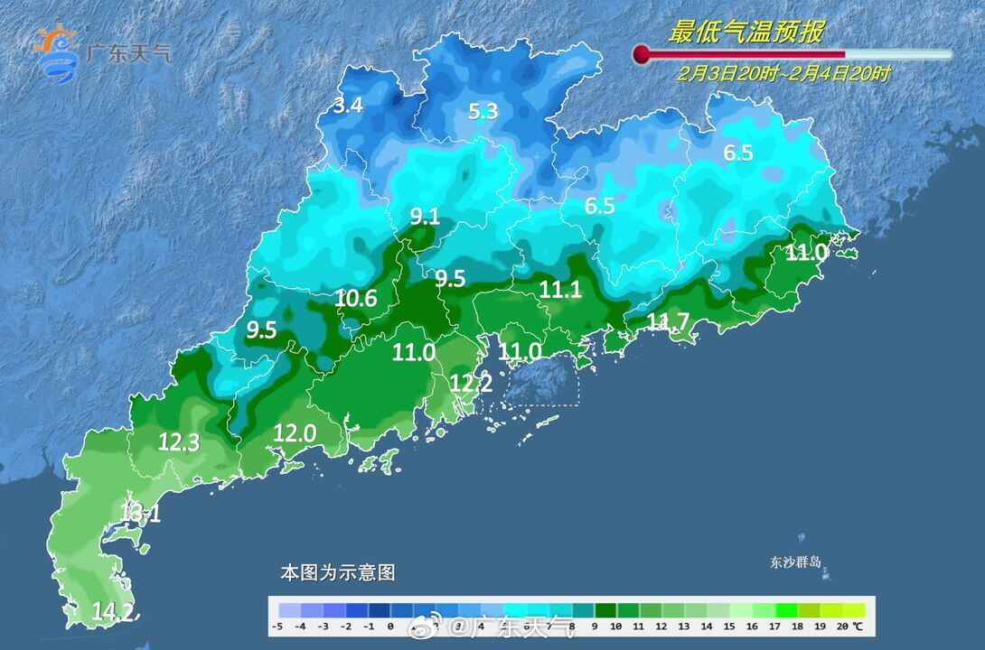 @广东天气 预计,2月3日到4日早晨,受冷空气影响,广东大部有小雨,日平均气温将下降5~8℃,4日白天到5日转多云天气,早晨前后将出现过程最低气温,粤北市县4~7℃(高海拔山区零下1~1℃)。另外,5日早晨粤西市县和广东省中西部海面有轻雾。