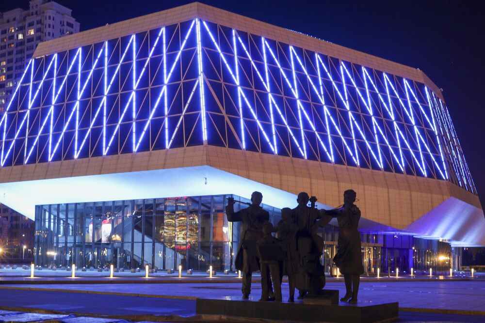 2022年11月20日,哈尔滨音乐厅为世界儿童日亮灯。