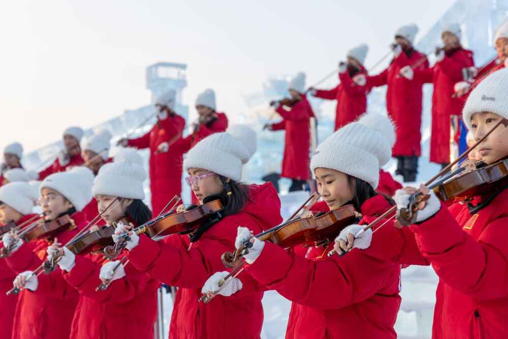 2025年1月12日,哈尔滨勋菲尔德少儿艺术团的小提琴演奏者在哈尔滨冰雪大世界园区内演奏音乐。