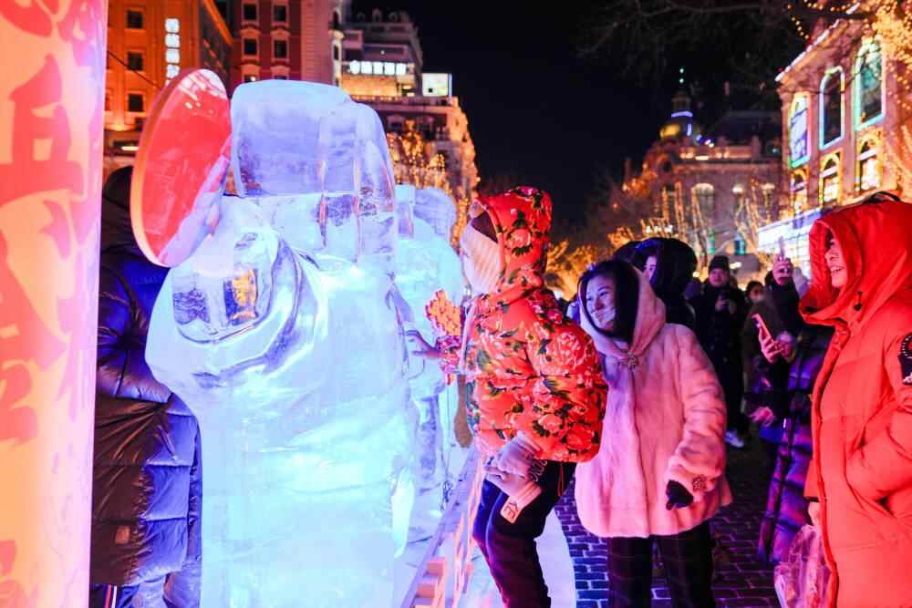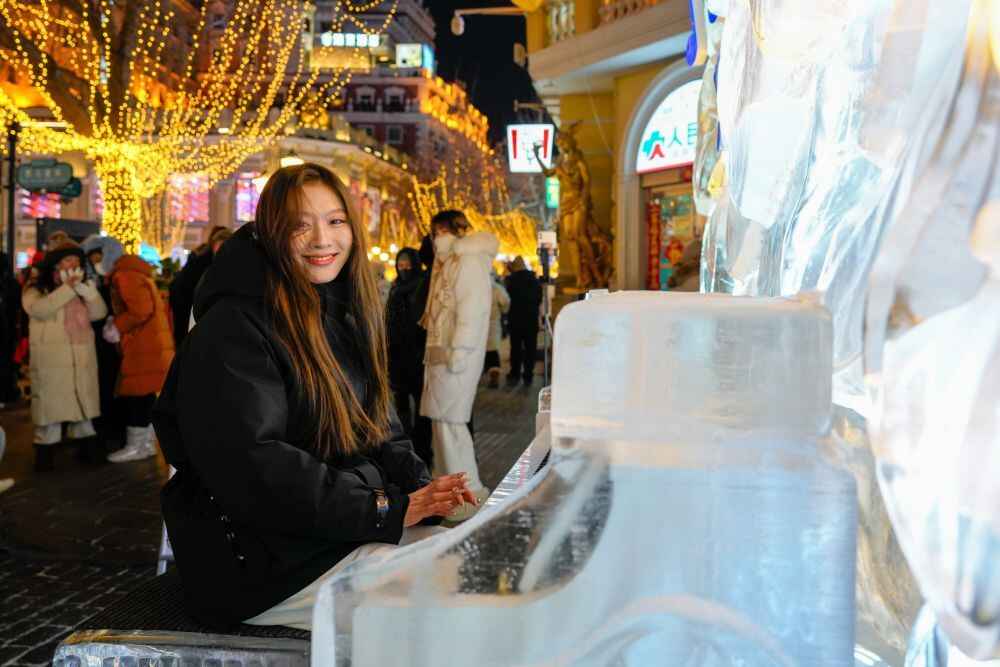 2025年1月30日,在哈尔滨中央大街上,一位女孩在冰钢琴上“弹奏一曲”。