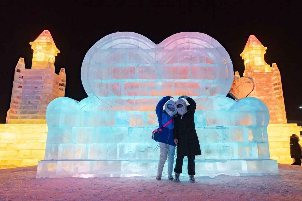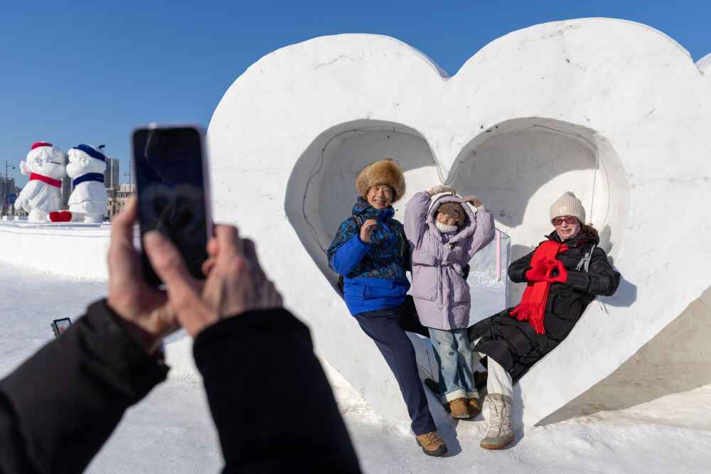 2025年1月15日,游客在“尔滨之心欢乐岛”内拍照。