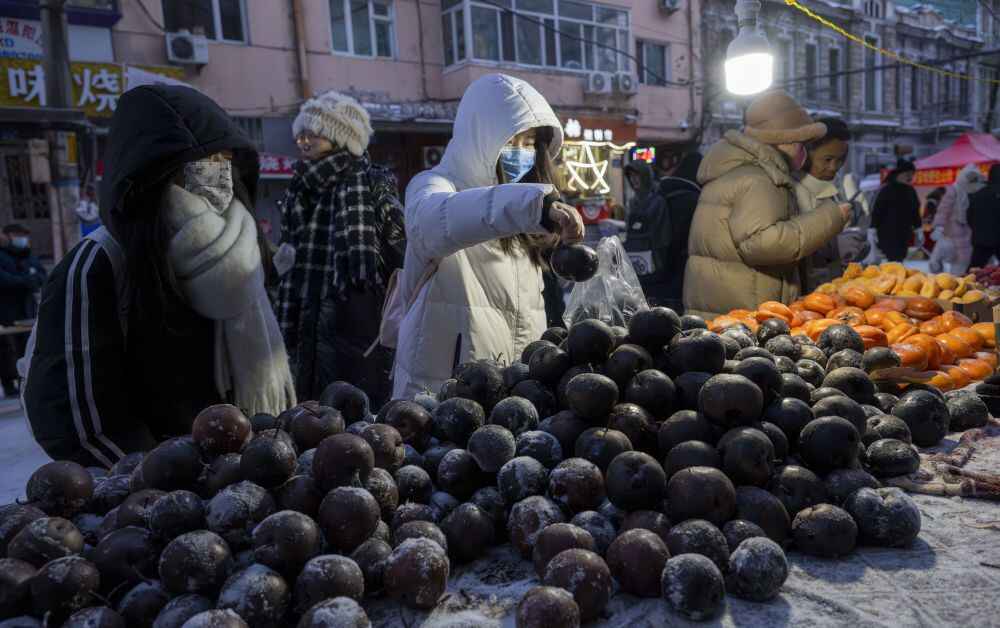 2024年1月22日,在黑龙江哈尔滨红专街早市,游客挑选冻梨和冻柿子。